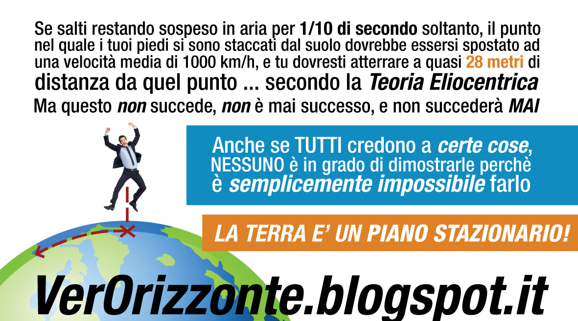 Chi ha seguito VerOrizzonte fino a questo punto dovrebbe ormai avere fugato ogni dubbio riguardo la Realtà Geocentrica, e come ad essa sia stata sostituita la Teoria Geocentrica in maniera completa e definitiva nel corso degli ultimi cinque secoli, per cui l'Utenza Globale moderna è assolutamente e FERMAMENTE convinta di vivere su una sfera più o meno difforme -malgrado le rare "prove fotografiche" che ritraggono una perfetta, Grande Palla- rotante sul proprio asse ad una velocità media di 1000 km/h.